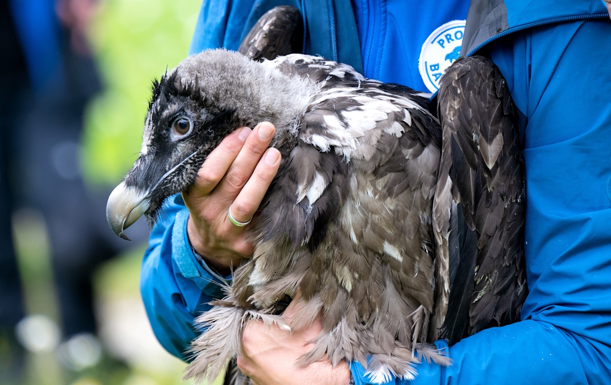 Ein Mitarbeiter im Nationalpark Berchtesgaden zeigt das Bartgeierweibchen Recka vor ihrer Auswilderung.