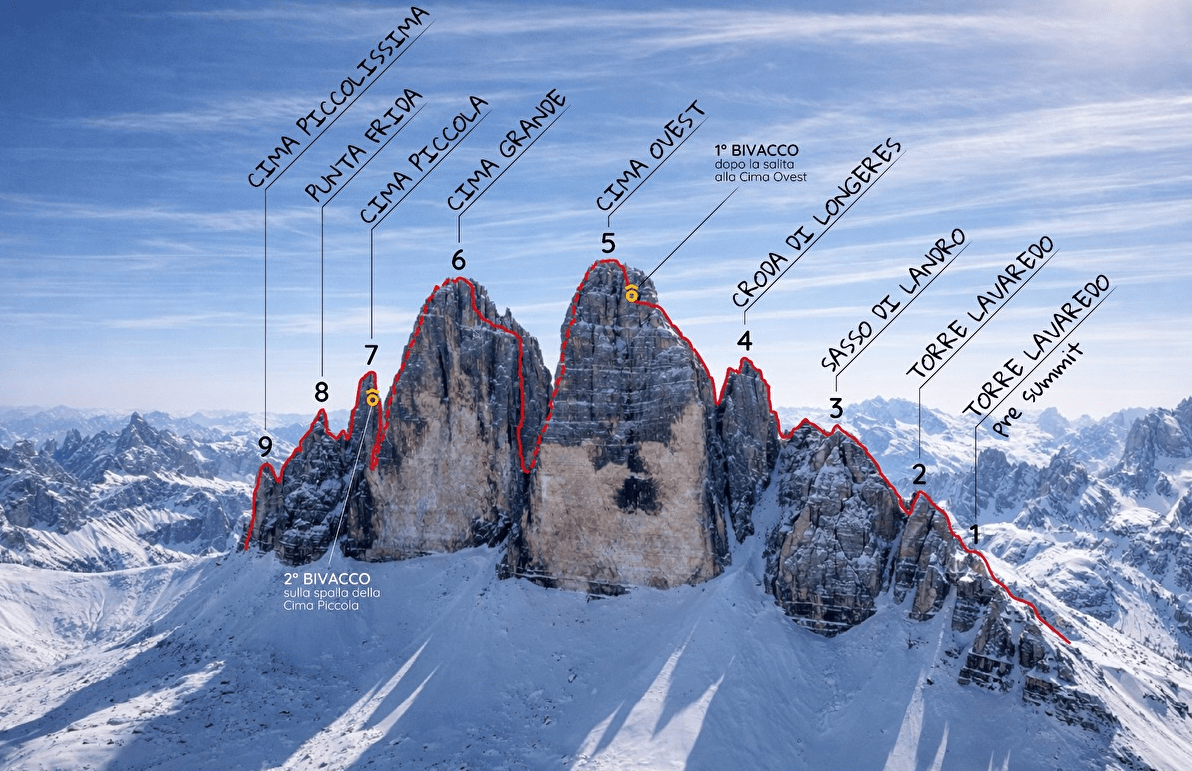 Baù und Grasso griffen diese Idee auf und beschlossen, die Linie erstmals im Winter zu wiederholen. Der Start erfolgte am Antornosee unterhalb der Drei Zinnen. Von dort gelangten die beiden Alpinisten zum Rifugio Auronzo, dem üblichen Ausgangs- und Stützpunkt für Touren in der Region. Ab dem Verlassen des bekannten Rundwegs folgten sie konsequent der logischen Skyline der Zinnen-Gruppe. Immer wieder wichen sie leicht von der Linie ab, um jeden einzelnen Turm der markanten Felsformation mitzunehmen.